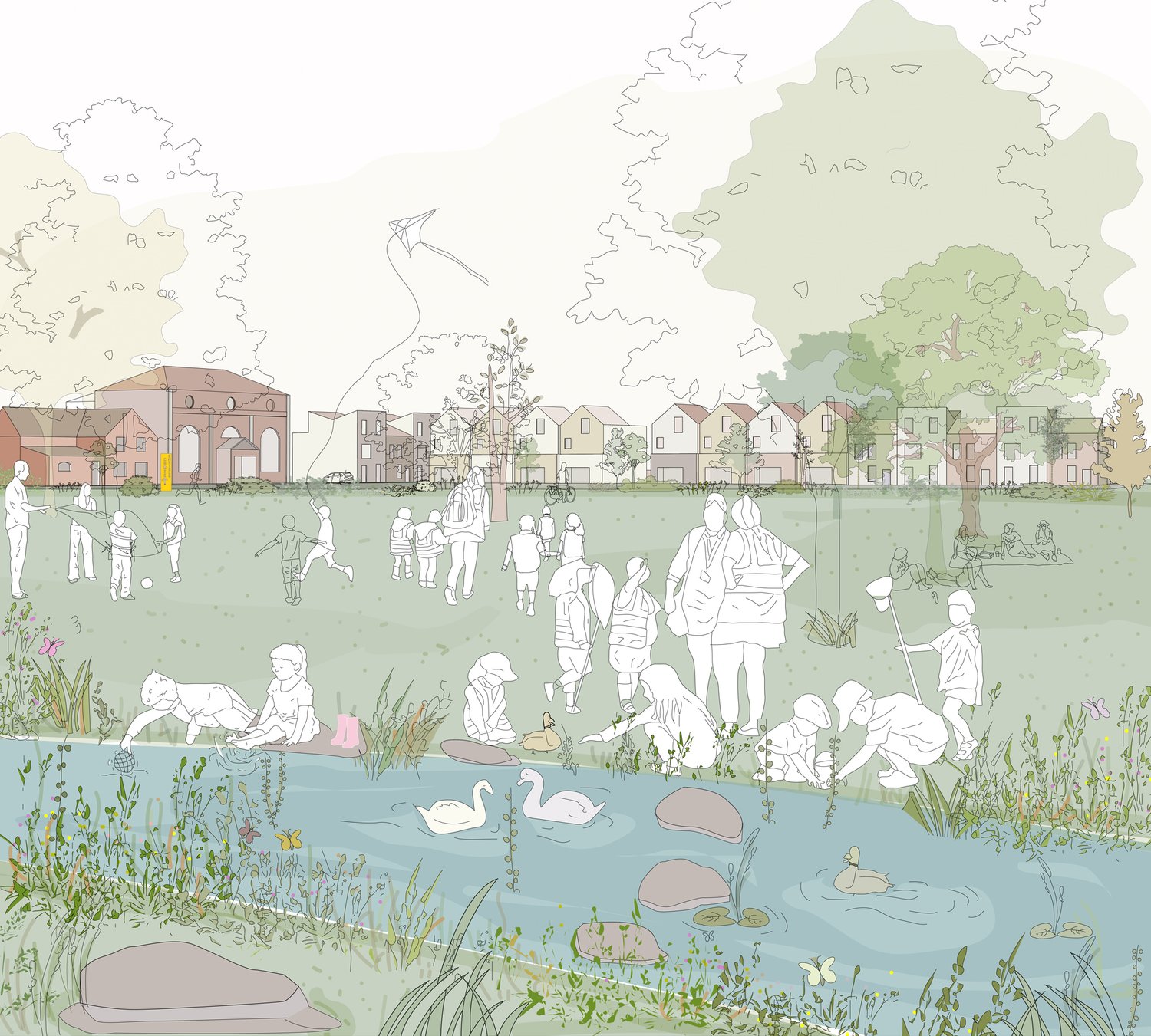 Our project benefitted from sitting within a wider council-led, large-scale landscape strategy to improve access, address flood risk at a borough level, rewild and improve the ecological value of surrounding farm land. This meant that in addition to providing the schools, employment opportunities, sports facilities and amenity that any sustainable new settlement must provide, there will also be the wider infrastructure to give those who live in the 5,500 homes access to the parkland, river valleys and open spaces around them.