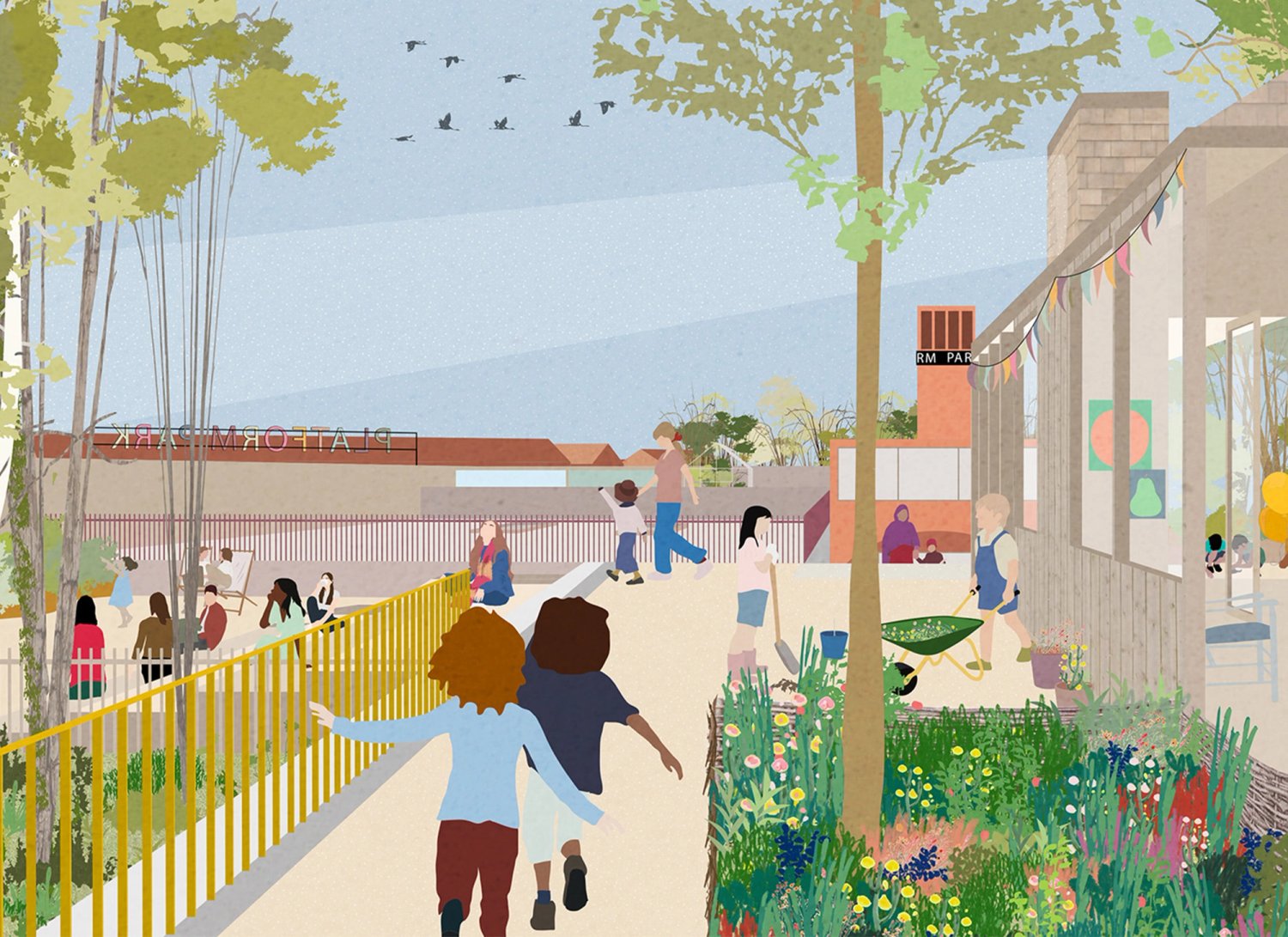 Image: Proposals to turn former station platforms into Rochdale Platform Park, with community facilities and new public space.
