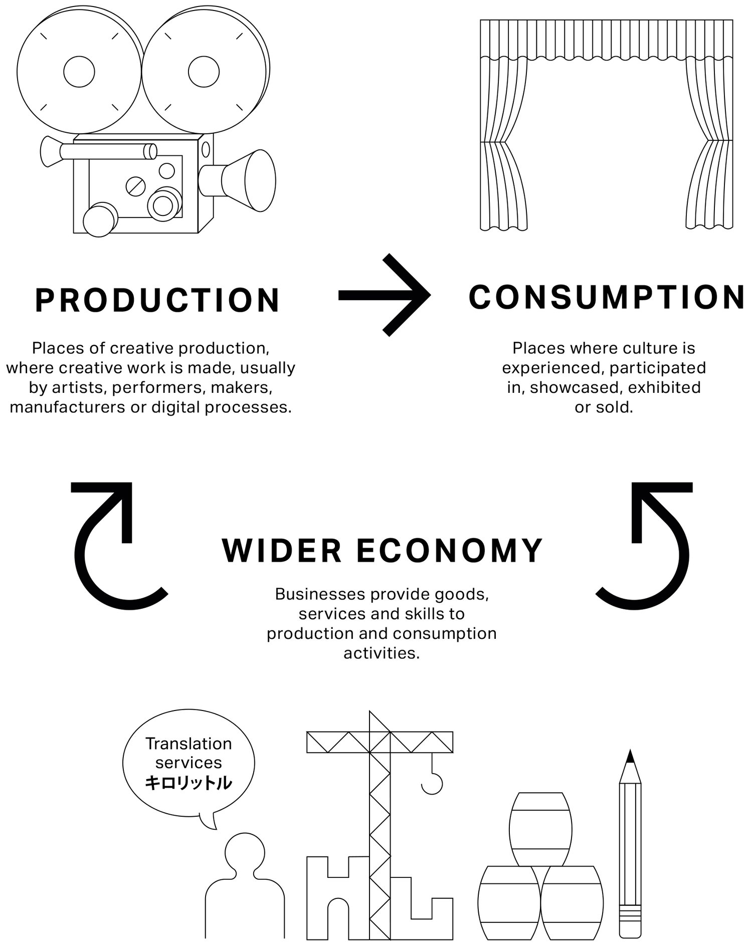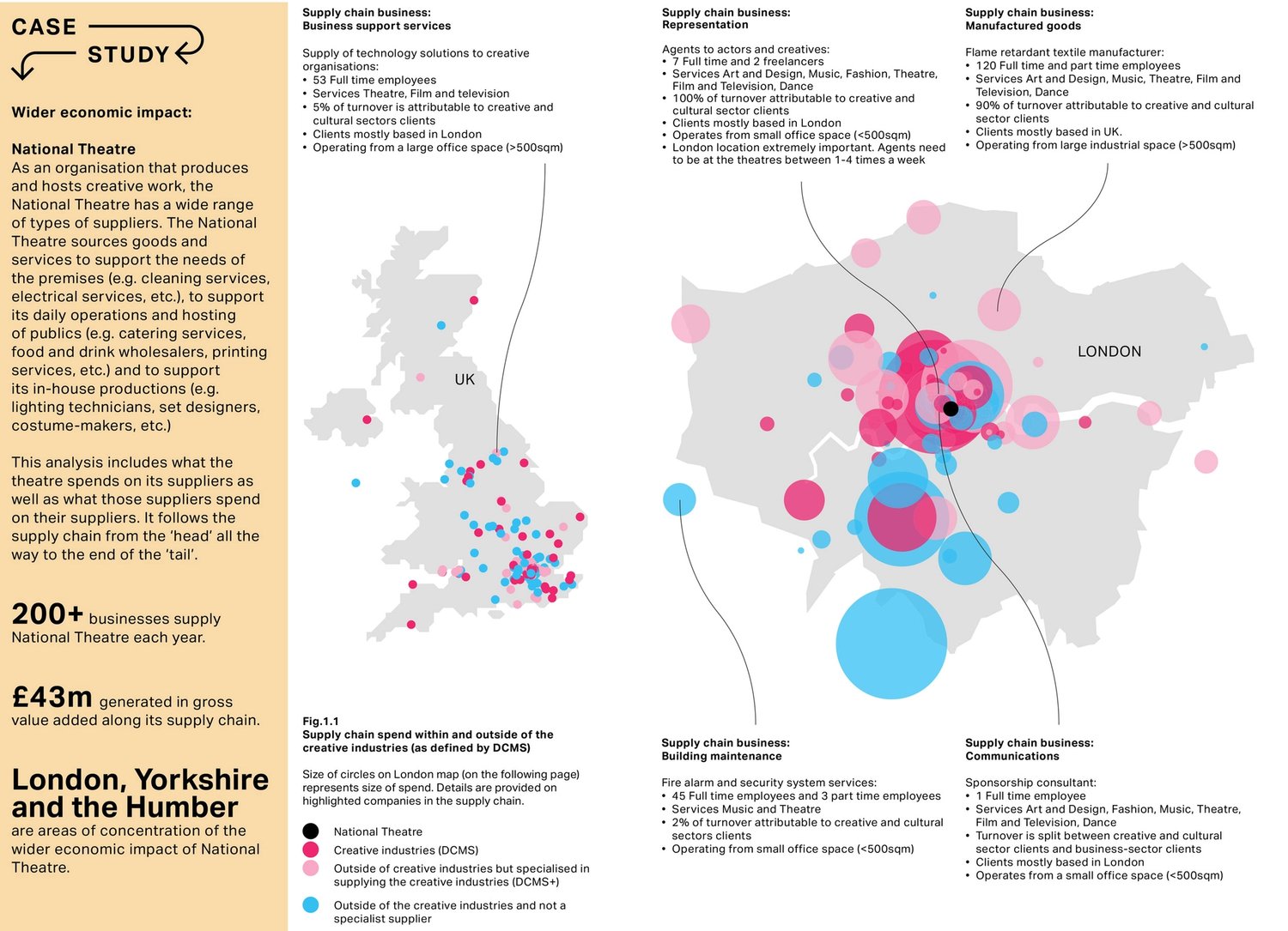 For example, the National Theatre is both a producer and consumer – it houses a substantial fabrication and manufacturing wing, as well as being supported by a network of over 200 businesses over the course of a year. These include security services providers, drinks wholesalers, timber merchants, and specialised chandlers. All these businesses also have their own set of suppliers. For instance, when needed the National Theatre has contracted Souvenir Scenic Studios, a set manufacturing company, which itself uses materials, equipment and specialised services from over 30 businesses across the UK.