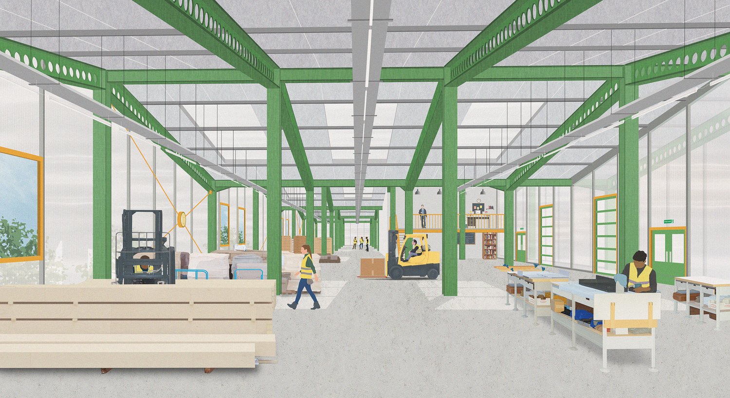 Models test the quantity of industrial and residential provision, location of yard space and goods lift access as well as the potential for urban greening. The final proposal combines new residential development stacked above a ground-level medium scale industrial unit. To the rear of the site, smaller scale units are stacked above each other and serviced via goods lifts. A roof-level terrace over the industrial unit below provides shared amenity for the new housing, whilst ancillary uses such as offices and cycle parking act as a buffer between the residential and industrial.