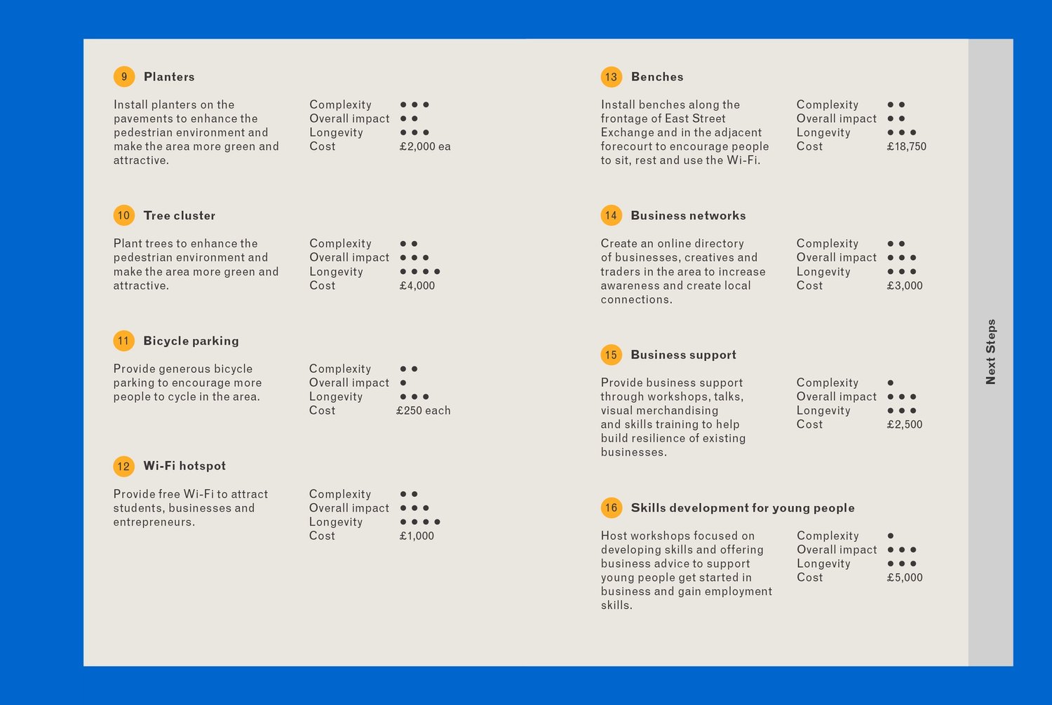 Proposals vary from the micro to the large-scale, from quick wins to long-term aims for growth. The catalogue includes recommendations that range from public realm enhancements to business support, identified development sites to potential meanwhile uses. The strategy is publicly downloadable as a tool to be used by local residents, community groups, public authorities and other stakeholders to take ownership and co-deliver projects.
